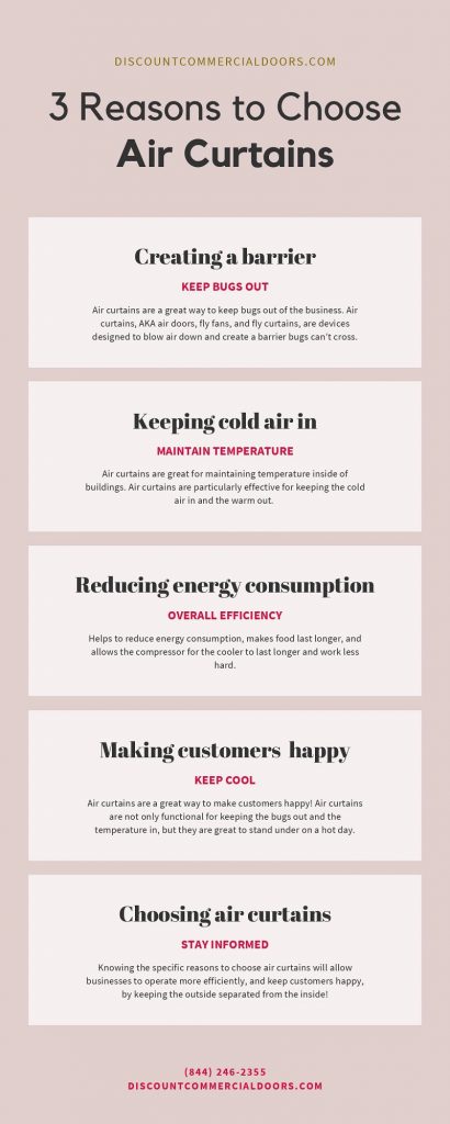 This type of air curtains are a great way to make customers happy! Fly curtains are not only functional for keeping the bugs out and the temperature in, but they are great to stand under on a hot day. Walking under an air curtain can instantly put a smile on the customer’s face, and it may make them more interested to walk into your business because you can leave the door open. Leaving the door open is a great way to make customers take a peek inside and venture into a store they may not have originally planned on entering. Knowing the specific reasons to choose air curtains will allow businesses to operate more efficiently, and keep customers happy, by keeping the outside separated from the inside!